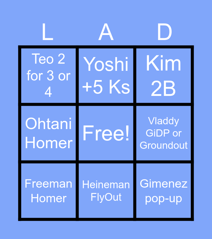 This bingo card has a free space and 8 words: Ohtani Homer, Yoshi +5 Ks, Vladdy GiDP or Groundout, Freeman Homer, Kim 2B, Teo 2 for 3 or 4, Heineman FlyOut and Gimenez pop-up.