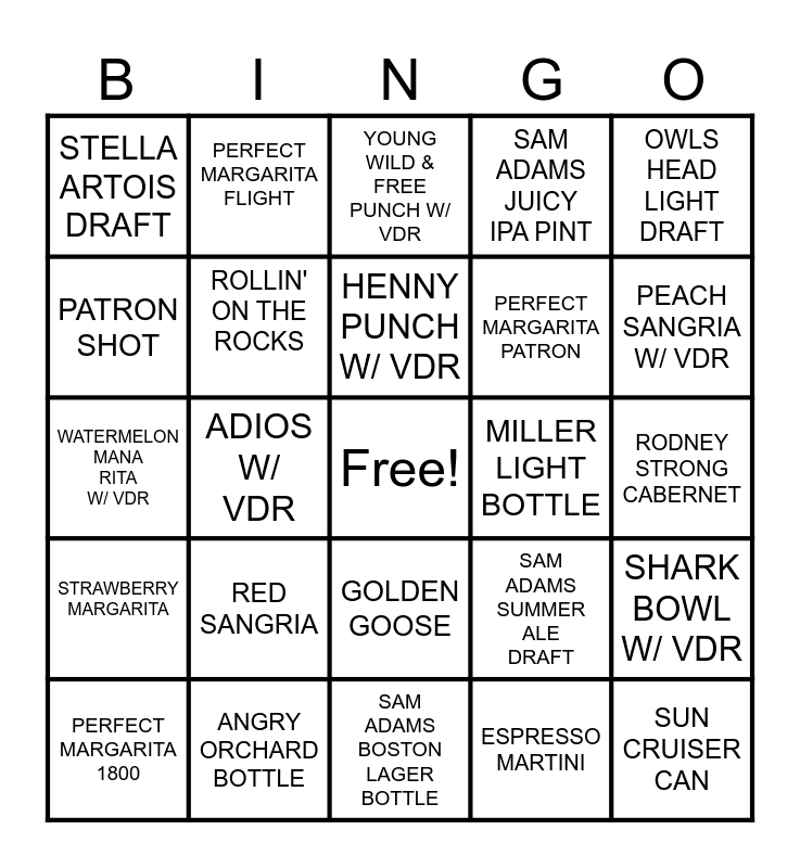 This bingo card has a free space and 24 words: RED SANGRIA, ANGRY ORCHARD BOTTLE, HENNY PUNCH W/ VDR, PERFECT MARGARITA 1800, OWLS HEAD LIGHT DRAFT, STELLA ARTOIS DRAFT, PATRON SHOT, PERFECT MARGARITA FLIGHT, MILLER LIGHT BOTTLE, GOLDEN GOOSE, PERFECT MARGARITA PATRON, WATERMELON MANA RITA W/ VDR, SAM ADAMS SUMMER ALE DRAFT, SHARK BOWL W/ VDR, ROLLIN' ON THE ROCKS, ESPRESSO MARTINI, RODNEY STRONG CABERNET, YOUNG WILD & FREE PUNCH W/ VDR, PEACH SANGRIA W/ VDR, ADIOS W/ VDR, SUN CRUISER CAN, STRAWBERRY MARGARITA, SAM ADAMS JUICY IPA PINT and SAM ADAMS BOSTON LAGER BOTTLE.