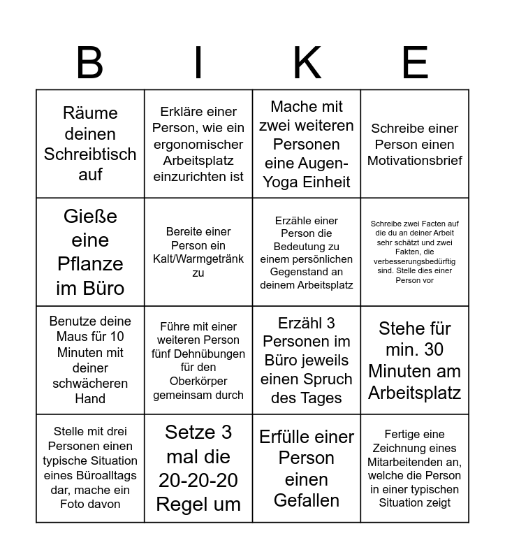 This bingo card has 16 words: Setze 3 mal die 20-20-20 Regel um, Stehe für min. 30 Minuten am Arbeitsplatz, Mache mit zwei weiteren Personen eine Augen-Yoga Einheit, Räume deinen Schreibtisch auf, Benutze deine Maus für 10 Minuten mit deiner schwächeren Hand, Erkläre einer Person, wie ein ergonomischer Arbeitsplatz einzurichten ist, Erzähl 3 Personen im Büro jeweils einen Spruch des Tages, Erfülle einer Person einen Gefallen, Gieße eine Pflanze im Büro, Bereite einer Person ein Kalt/Warmgetränk zu, Stelle mit drei Personen einen typische Situation eines Büroalltags dar, mache ein Foto davon, Schreibe einer Person einen Motivationsbrief, Führe mit einer weiteren Person fünf Dehnübungen für den Oberkörper gemeinsam durch, Schreibe zwei Facten auf die du an deiner Arbeit sehr schätzt und zwei Fakten, die verbesserungsbedürftig sind. Stelle dies einer Person vor, Erzähle einer Person die Bedeutung zu einem persönlichen Gegenstand an deinem Arbeitsplatz and Fertige eine Zeichnung eines Mitarbeitenden an, welche die Person in einer typischen Situation zeigt.