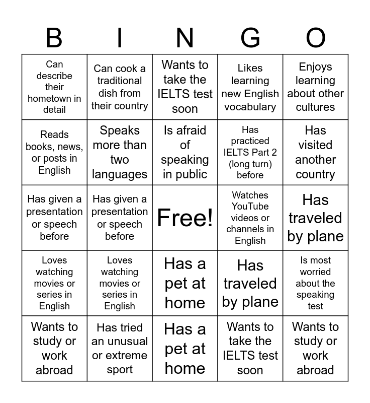 This bingo card has a free space and 49 words: Has visited another country, Wants to study or work abroad, Can play a musical instrument, Has a pet at home, Loves watching movies or series in English, Has a brother or sister, Can cook a traditional dish from their country, Exercises or plays sports regularly, Reads books, news, or posts in English, Has tried an unusual or extreme sport, Speaks more than two languages, Likes learning new English vocabulary, Is most worried about the speaking test, Has traveled by plane, FREE, Dreams of living in another country one day, Is afraid of speaking in public, Watches YouTube videos or channels in English, Has a favorite English song or singer, Enjoys learning about other cultures, Has given a presentation or speech before, Wants to take the IELTS test soon, Can describe their hometown in detail, Has practiced IELTS Part 2 (long turn) before, Uses English outside of class (with friends, games, etc.), Has visited another country, Wants to study or work abroad, Can play a musical instrument, Has a pet at home, Loves watching movies or series in English, Has a brother or sister, Can cook a traditional dish from their country, Exercises or plays sports regularly, Reads books, news, or posts in English, Has tried an unusual or extreme sport, Speaks more than two languages, Likes learning new English vocabulary, Is most worried about the speaking test, Has traveled by plane, Dreams of living in another country one day, Is afraid of speaking in public, Watches YouTube videos or channels in English, Has a favorite English song or singer, Enjoys learning about other cultures, Has given a presentation or speech before, Wants to take the IELTS test soon, Can describe their hometown in detail, Has practiced IELTS Part 2 (long turn) before and Uses English outside of class (with friends, games, etc.).