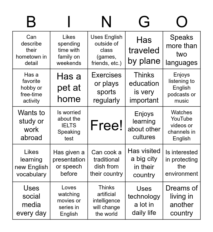 This bingo card has a free space and 40 words: Has visited another country, Wants to study or work abroad, Can play a musical instrument, Has a pet at home, Loves watching movies or series in English, Can cook a traditional dish from their country, Exercises or plays sports regularly, Reads books, news or posts in English, Speaks more than two languages, Likes learning new English vocabulary, Is worried about the IELTS Speaking test, Has traveled by plane, Dreams of living in another country, Watches YouTube videos or channels in English, Enjoys learning about other cultures, Has given a presentation or speech before, Wants to take the IELTS test soon, Can describe their hometown in detail, Has practiced IELTS Part 2 (long turn) before, Uses English outside of class (games, friends, etc.), Is interested in protecting the environment, Uses technology a lot in daily life, Thinks education is very important, Has a favorite hobby or free-time activity, Would like to improve speaking skills the most, Has a brother or sister, Is afraid of public speaking, Has a favorite English song or singer, Likes trying new food from other countries, Plays video games or computer games, Wants to learn more about climate change, Uses social media every day, Can talk about their future plans easily, Has visited a big city in their country, Enjoys listening to English podcasts or music, Thinks artificial intelligence will change the world, Has helped someone learn English before, Can describe their favorite teacher, Likes spending time with family on weekends and Believes travel is the best way to learn.