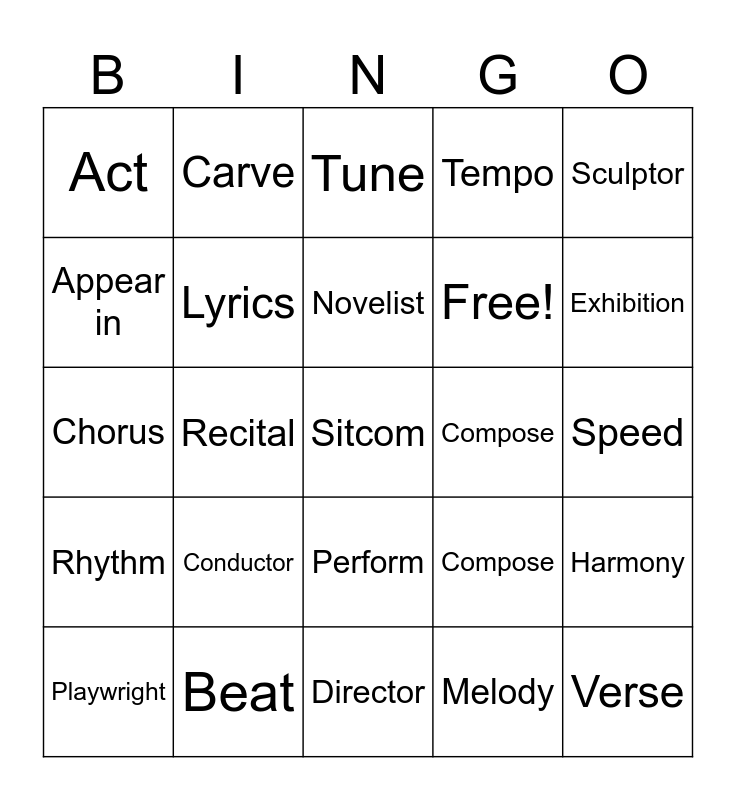 This bingo card has 25 words: Conductor, Director, Novelist, Playwright, Sculptor, Act, Appear in, Carve, Compose, Perform, Free!, Chorus, Compose, Harmony, Lyrics, Verse, Speed, Tune, Exhibition, Recital, Sitcom, Beat, Rhythm, Tempo and Melody.