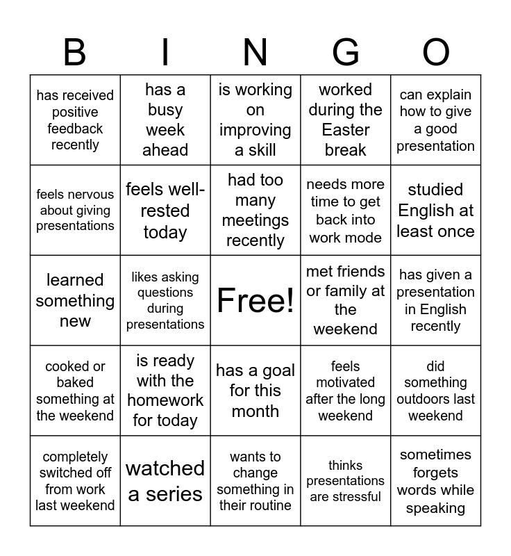 This bingo card has a free space and 27 words: feels motivated after the long weekend, has learned a new English word or phrase recently, needs more time to get back into work mode, wants to change something in their routine, feels nervous about giving presentations, is working on improving a skill, has a busy week ahead, cooked or baked something at the weekend, met friends or family at the weekend, did something outdoors last weekend, learned something new, worked during the Easter break, completely switched off from work last weekend, watched a series, studied English at least once, gave a presentation recently, feels well-rested today, had too many meetings recently, is ready with the homework for today, has received positive feedback recently, has given a presentation in English recently, thinks presentations are stressful, likes asking questions during presentations, sometimes forgets words while speaking, has a goal for this month, can explain how to give a good presentation and can share a productivity tip.