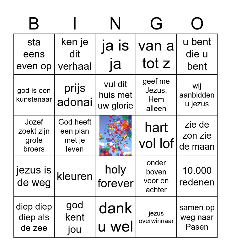This bingo card has a free space and 24 words: kleuren, god kent jou, vul dit huis met uw glorie, diep diep diep als de zee, u bent die u bent, sta eens even op, god is een kunstenaar, ken je dit verhaal, hart vol lof, holy forever, geef me Jezus, Hem alleen, Jozef zoekt zijn grote broers, onder boven voor en achter, 10.000 redenen, prijs adonai, jezus overwinnaar, zie de zon zie de maan, ja is ja, wij aanbidden u jezus, God heeft een plan met je leven, samen op weg naar Pasen, jezus is de weg, van a tot z and dank u wel.