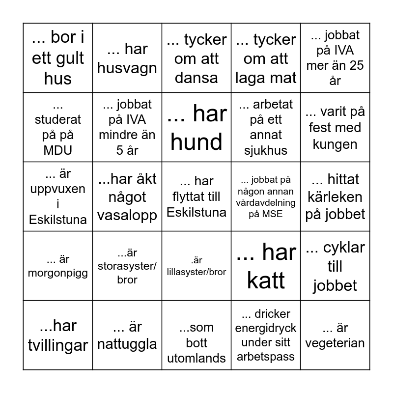 This bingo card has 25 words: ...är storasyster/ bror, ...som bott utomlands, ... har hund, ...har tvillingar, ... jobbat på IVA mer än 25 år, ... bor i ett gult hus, ... studerat på på MDU, ... har husvagn, ... jobbat på någon annan vårdavdelning på MSE, .är lillasyster/bror, ... arbetat på ett annat sjukhus, ... är uppvuxen i Eskilstuna, ... har katt, ... cyklar till jobbet, ... jobbat på IVA mindre än 5 år, ... är vegeterian, ... hittat kärleken på jobbet, ... tycker om att dansa, ... varit på fest med kungen, ...har åkt något vasalopp, ... har flyttat till Eskilstuna, ... är nattuggla, ... är morgonpigg, ... tycker om att laga mat and ... dricker energidryck under sitt arbetspass.
