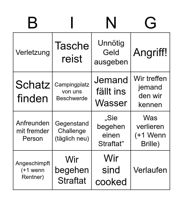 This bingo card has 16 words: Wir begehen Straftat, Was verlieren (+1 Wenn Brille), Unnötig Geld ausgeben, Verletzung, Anfreunden mit fremder Person, Tasche reist, „Sie begehen einen Straftat”, Wir sind cooked, Schatz finden, Campingplatz von uns Beschwerde, Angeschimpft (+1 wenn Rentner), Angriff!, Gegenstand Challenge (täglich neu), Wir treffen jemand den wir kennen, Jemand fällt ins Wasser and Verlaufen.