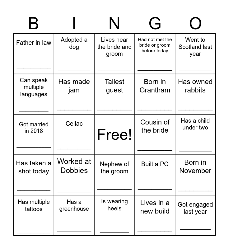 This bingo card has a free space and 24 words: Worked at Dobbies ________, Has a greenhouse ___________, Tallest guest _________, Has multiple tattoos __________, Went to Scotland last year __________, Father in law __________, Can speak multiple languages _________, Adopted a dog __________, Cousin of the bride _________, Nephew of the groom __________, Born in Grantham _________, Got married in 2018 ___________, Built a PC __________, Born in November _________, Has made jam _________, Lives in a new build _________, Has a child under two __________, Lives near the bride and groom __________, Has owned rabbits _________, Celiac __________, Got engaged last year _________, Has taken a shot today _________, Had not met the bride or groom before today _____________ and Is wearing heels _________.