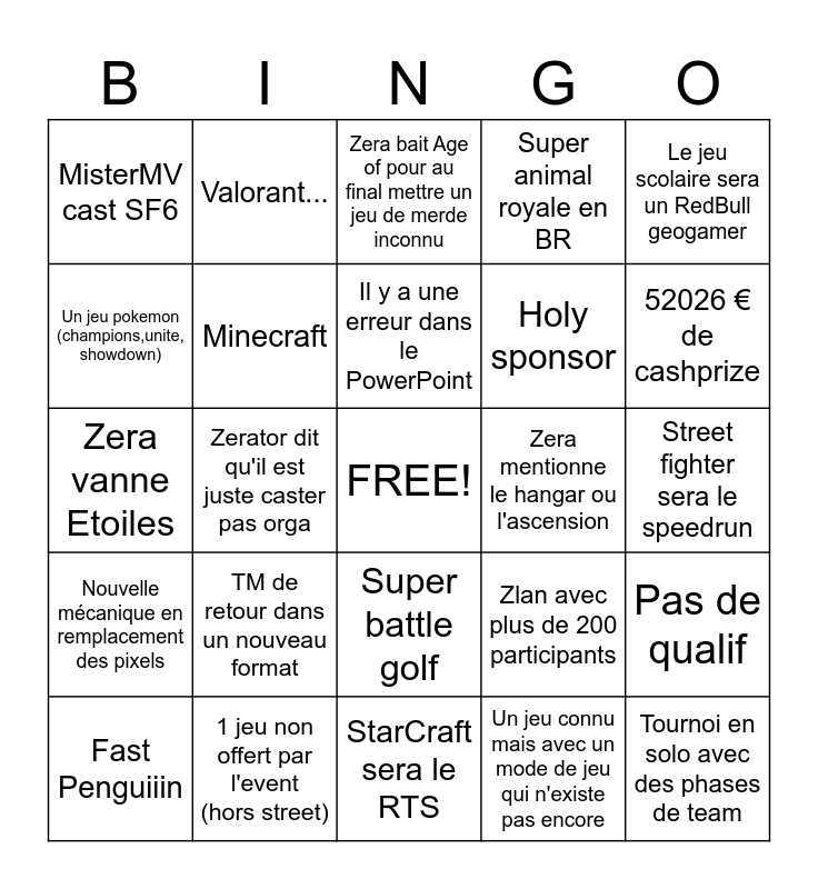 This bingo card has a free space and 24 words: TM de retour dans un nouveau format, 1 jeu non offert par l'event (hors street), Il y a une erreur dans le PowerPoint, Fast Penguiiin, Le jeu scolaire sera un RedBull geogamer, MisterMV cast SF6, Un jeu pokemon (champions,unite, showdown), Valorant..., Zera mentionne le hangar ou l'ascension, Super battle golf, Holy sponsor, Zera vanne Etoiles, Zlan avec plus de 200 participants, Pas de qualif, Minecraft, Un jeu connu mais avec un mode de jeu qui n'existe pas encore, Street fighter sera le speedrun, Zera bait Age of pour au final mettre un jeu de merde inconnu, 52026 € de cashprize, Zerator dit qu'il est juste caster pas orga, Tournoi en solo avec des phases de team, Nouvelle mécanique en remplacement des pixels, Super animal royale en BR and StarCraft sera le RTS.