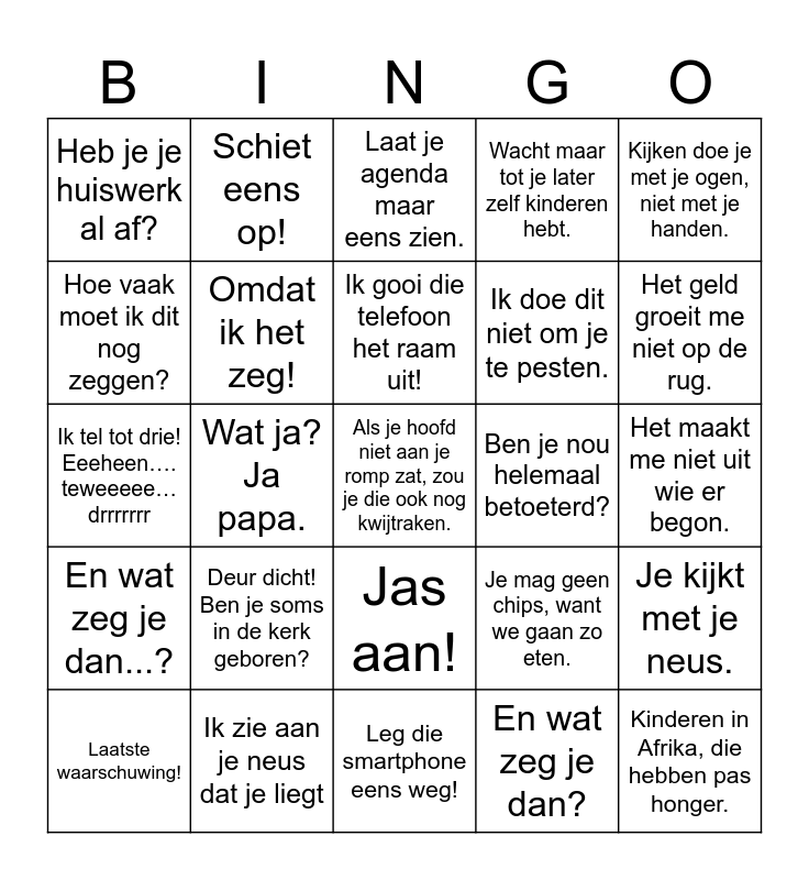 This bingo card has a free space and 31 words: Leg die smartphone eens weg!, Het is hier geen hotel., Wat ja? Ja papa., Toen ik zo oud was als jij..., Heb je je huiswerk al af?, Laat je agenda maar eens zien., Omdat ik het zeg!, Je mag geen chips, want we gaan zo eten., Ben je nou helemaal betoeterd?, En wat zeg je dan?, Het maakt me niet uit wie er begon., Kinderen in Afrika, die hebben pas honger., Licht uit als je wegggaat.', Oh, iedereen in jouw klas mag dat? Jammer, jij bent niet iedereen.', Het geld groeit me niet op de rug., Ik ben toch zeker Sinterklaas niet., Je kijkt met je neus., Deur dicht! Ben je soms in de kerk geboren?, En wat zeg je dan...?, Jas aan!, Kijken doe je met je ogen, niet met je handen., Je krijgt nog eens vierkante ogen., Laatste waarschuwing!, Schiet eens op!, Ik doe dit niet om je te pesten., Hoe vaak moet ik dit nog zeggen?, Wacht maar tot je later zelf kinderen hebt., Ik tel tot drie! Eeeheen…. teweeeee…drrrrrrr, Ik zie aan je neus dat je liegt, Ik gooi die telefoon het raam uit! and Die trui, heb je die nu alweer aan?.