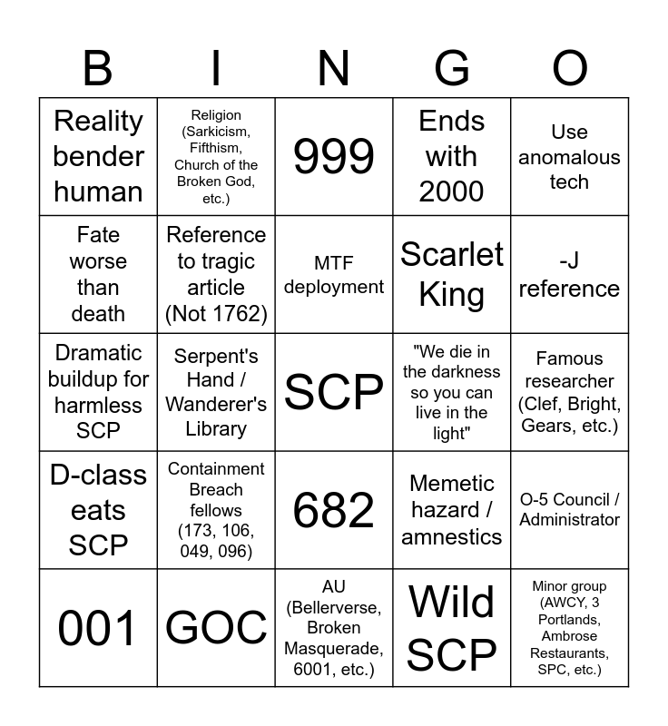 This bingo card has a free space and 24 words: Containment Breach fellows (173, 106, 049, 096), GOC, MTF deployment, 001, Use anomalous tech, Reality bender human, Fate worse than death, Religion (Sarkicism, Fifthism, Church of the Broken God, etc.), "We die in the darkness so you can live in the light", 682, Scarlet King, Dramatic buildup for harmless SCP, Memetic hazard / amnestics, O-5 Council / Administrator, Reference to tragic article (Not 1762), Wild SCP, Famous researcher (Clef, Bright, Gears, etc.), 999, -J reference, Serpent's Hand / Wanderer's Library, Minor group (AWCY, 3 Portlands, Ambrose Restaurants, SPC, etc.), D-class eats SCP, Ends with 2000 and AU (Bellerverse, Broken Masquerade, 6001, etc.).