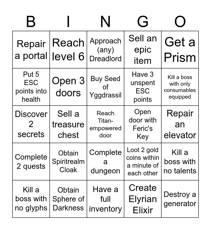 This bingo card has 35 words: Complete 2 boss challenges successfully, Kill the mob to the left of spawning point, Hit a target dummy for 20s, Open 3 doors, Complete a dungeon, Sell an epic item, Put 5 ESC points into health, Gain a life, Buy Seed of Yggdrassil, Kill 3 bosses, Discover 2 secrets, Get a Prism, Die to (any) trap, Repair Queen's Crown, Repair a portal, Open door with Feric's Key, Create Elyrian Elixir, Sell a treasure chest, Complete 2 quests, Reach Titan-empowered door, Loot 2 gold coins within a minute of each other, Kill a boss with no glyphs, Kill a boss with no talents, Obtain Sphere of Darkness, Approach (any) Dreadlord, Kill a boss with only consumables equipped, Destroy a generator, Talk to a goblin shopkeeper, Have 3 unspent ESC points, Repair an elevator, Use (any) waygate, Have a full inventory, Obtain Spiritrealm Cloak, Reach level 6 and Transmute any items.