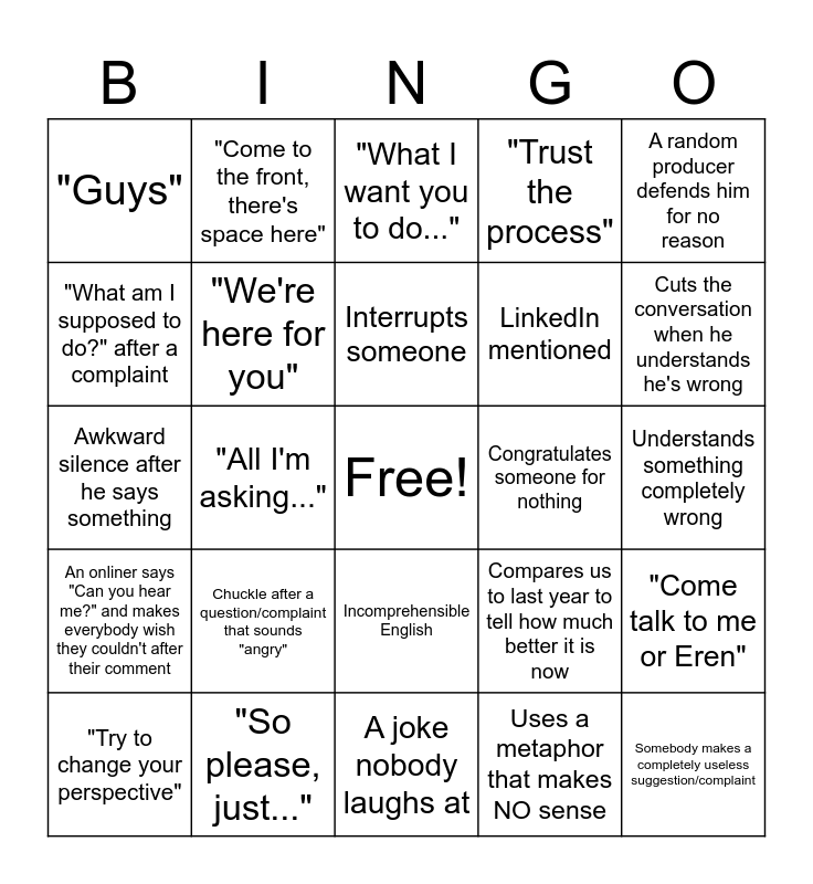 This bingo card has a free space and 24 words: Chuckle after a question/complaint that sounds "angry", "So please, just...", Interrupts someone, "Try to change your perspective", A random producer defends him for no reason, "Guys", "What am I supposed to do?" after a complaint, "Come to the front, there's space here", Congratulates someone for nothing, Incomprehensible English, LinkedIn mentioned, Awkward silence after he says something, Compares us to last year to tell how much better it is now, "Come talk to me or Eren", "We're here for you", Uses a metaphor that makes NO sense, Understands something completely wrong, "What I want you to do...", Cuts the conversation when he understands he's wrong, "All I'm asking...", Somebody makes a completely useless suggestion/complaint, An onliner says "Can you hear me?" and makes everybody wish they couldn't after their comment, "Trust the process" and A joke nobody laughs at.