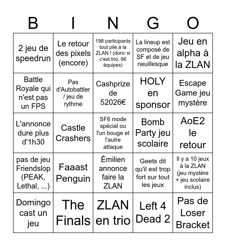 This bingo card has 25 words: Faaast Penguin, ZLAN en trio, Cashprize de 52026€, Domingo cast un jeu, Jeu en alpha à la ZLAN, 2 jeu de speedrun, Battle Royale qui n'est pas un FPS, Le retour des pixels (encore), Bomb Party jeu scolaire, Émilien annonce faire la ZLAN, HOLY en sponsor, L'annonce dure plus d'1h30, Geets dit qu'il est trop fort sur tout les jeux, Il y a 10 jeux à la ZLAN (jeu mystère + jeu scolaire inclus), Pas d'Autobattler / jeu de rythme, Pas de Loser Bracket, AoE2 le retour, 198 participants tout pile à la ZLAN ! (donc si c'est trio, 66 équipes), Escape Game jeu mystère, Castle Crashers, SF6 mode spécial ou l'un bouge et l'autre attaque, The Finals, pas de jeu Friendslop (PEAK, Lethal, ...), La lineup est composé de SF et de jeu neuillesque and Left 4 Dead 2.