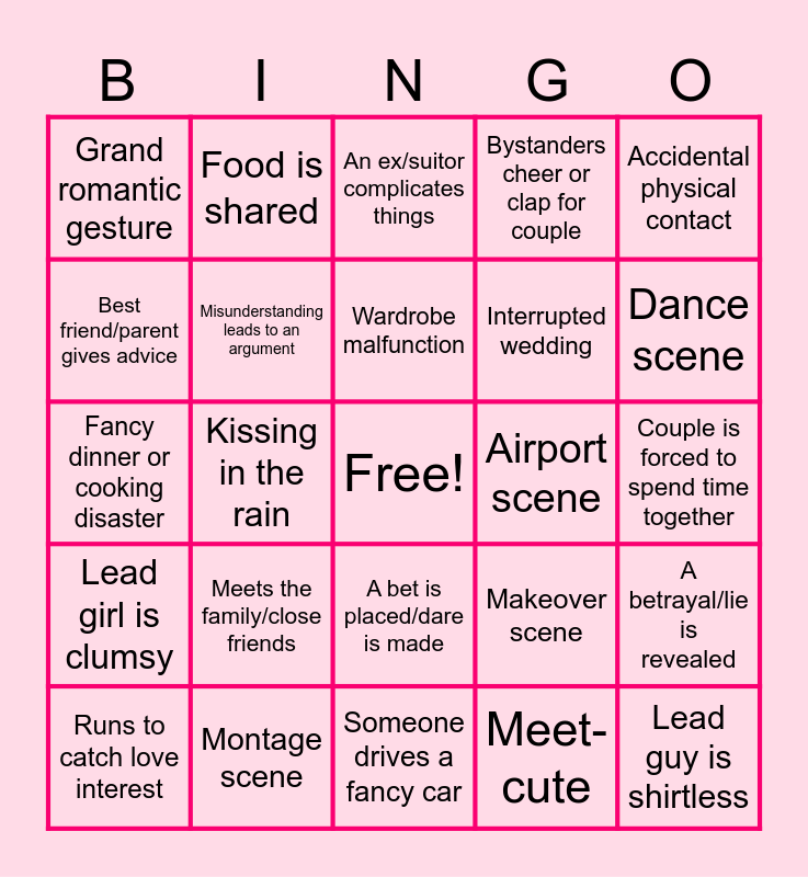 This bingo card has a free space and 24 words: Meets the family/close friends, Montage scene, Wardrobe malfunction, Runs to catch love interest, Accidental physical contact, Grand romantic gesture, Best friend/parent gives advice, Food is shared, Airport scene, A bet is placed/dare is made, Interrupted wedding, Fancy dinner or cooking disaster, Makeover scene, A betrayal/lie is revealed, Misunderstanding leads to an argument, Meet-cute, Couple is forced to spend time together, An ex/suitor complicates things, Dance scene, Kissing in the rain, Lead guy is shirtless, Lead girl is clumsy, Bystanders cheer or clap for couple and Someone drives a fancy car.