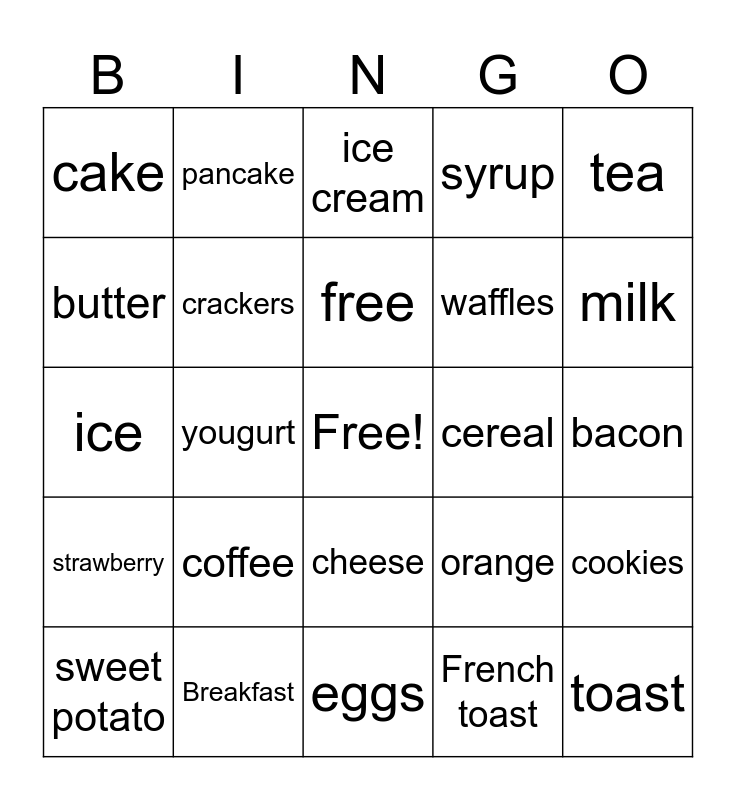 This bingo card has a free space and 30 words: Breakfast, apple, yougurt, grapes, cake, ice cream, crackers, cheese, cereal, eggs, bacon, toast, French toast, juice, milk, chocolate, orange, strawberry, coffee, tea, ice, sausage, pancake, waffles, butter, syrup, cookies, sweet potato, free and yogurt.