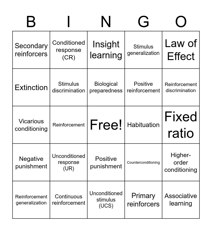 This bingo card has a free space and 49 words: Behavioral perspective, Associative learning, Classical conditioning, Unconditioned stimulus (UCS), Unconditioned response (UR), Conditioned stimulus (CS), Conditioned response (CR), Acquisition, Extinction, Spontaneous recovery, Stimulus discrimination, Stimulus generalization, Higher-order conditioning, Counterconditioning, One-trial conditioning, Taste aversion, Biological preparedness, Habituation, Operant conditioning, Law of Effect, Reinforcement, Primary reinforcers, Secondary reinforcers, Positive reinforcement, Negative reinforcement, Reinforcement discrimination, Reinforcement generalization, Punishment, Positive punishment, Negative punishment, Shaping, Instinctive drift, Superstitious behavior, Reinforcement schedules, Continuous reinforcement, Partial reinforcement, Fixed interval, Variable interval, Fixed ratio, Variable ratio, Scalloped graph, Learned helplessness, Social learning theory, Modeling, Vicarious conditioning, Insight learning, Latent learning, Cognitive maps and Little Albert Experiment.