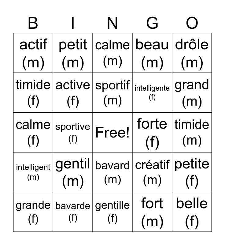 This bingo card has a free space and 24 words: gentil (m), bavarde (f), sportif (m), grande (f), drôle (m), actif (m), timide (f), petit (m), forte (f), bavard (m), intelligente (f), calme (f), créatif (m), petite (f), active (f), fort (m), timide (m), calme (m), grand (m), sportive (f), belle (f), intelligent (m), beau (m) and gentille (f).