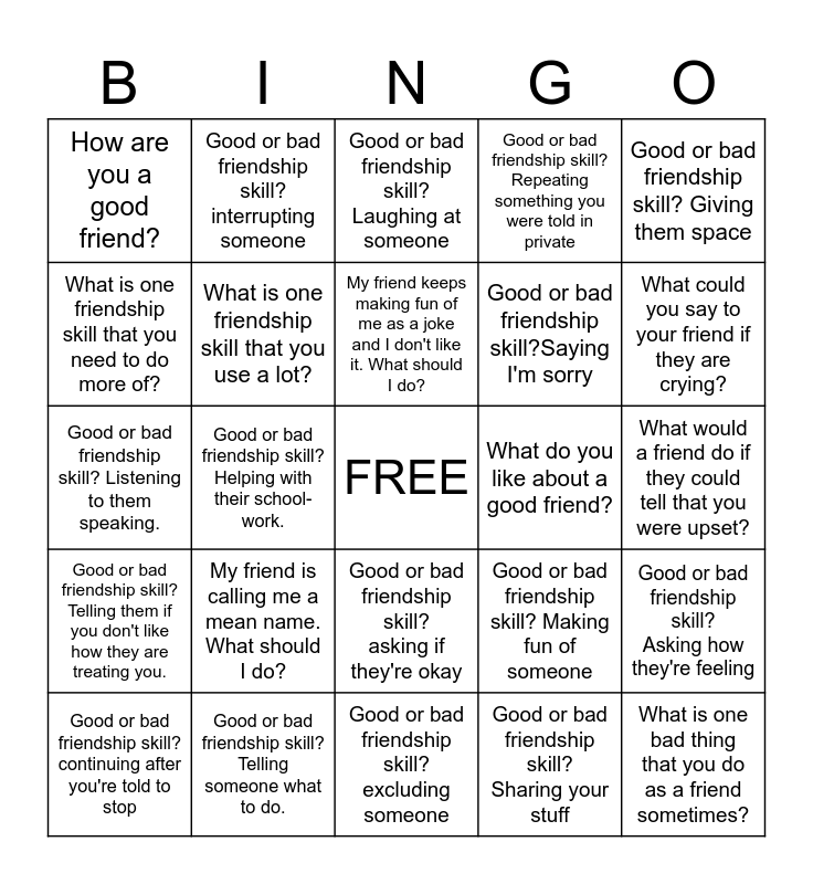 This bingo card has a free space and 24 words: My friend is calling me a mean name. What should I do?, Good or bad friendship skill? Telling someone what to do., My friend keeps making fun of me as a joke and I don't like it. What should I do?, Good or bad friendship skill? continuing after you're told to stop, Good or bad friendship skill? Giving them space, How are you a good friend?, What is one friendship skill that you need to do more of?, Good or bad friendship skill? interrupting someone, What do you like about a good friend?, Good or bad friendship skill? asking if they're okay, Good or bad friendship skill?Saying I'm sorry, Good or bad friendship skill? Listening to them speaking., Good or bad friendship skill? Making fun of someone, Good or bad friendship skill? Asking how they're feeling, What is one friendship skill that you use a lot?, Good or bad friendship skill? Sharing your stuff, What would a friend do if they could tell that you were upset?, Good or bad friendship skill? Laughing at someone, What could you say to your friend if they are crying?, Good or bad friendship skill? Helping with their school-work., What is one bad thing that you do as a friend sometimes?, Good or bad friendship skill? Telling them if you don't like how they are treating you., Good or bad friendship skill? Repeating something you were told in private and Good or bad friendship skill? excluding someone.