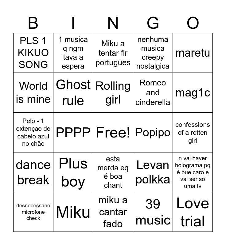 This bingo card has a free space and 24 words: Plus boy, Miku, Rolling girl, desnecessario microfone check, maretu, PLS 1 KIKUO SONG, World is mine, 1 musica q ngm tava a espera, Popipo, esta merda eq é boa chant, Romeo and cinderella, Pelo - 1 extençao de cabelo azul no chão, Levan polkka, n vai haver holograma pq é bue caro e vai ser so uma tv, Ghost rule, 39 music, confessions of a rotten girl, Miku a tentar flr portugues, mag1c, PPPP, Love trial, dance break, nenhuma musica creepy nostalgica and miku a cantar fado.