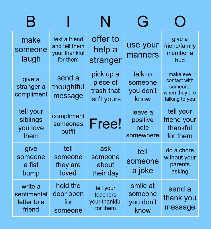This bingo card has a free space and 24 words: tell someone they are loved, hold the door open for someone, pick up a piece of trash that isn't yours, write a sentimental letter to a friend, give a friend/family member a hug, make someone laugh, give a stranger a compliment, text a friend and tell them your thankful for them, leave a positive note somewhere, ask someone about their day, talk to someone you don't know, tell your siblings you love them, tell someone a joke, do a chore without your parents asking, send a thoughtful message, smile at someone you don't know, tell your friend your thankful for them, offer to help a stranger, make eye contact with someone when they are talking to you, compliment someones outfit, send a thank you message, give someone a fist bump, use your manners and tell your teachers your thankful for them.