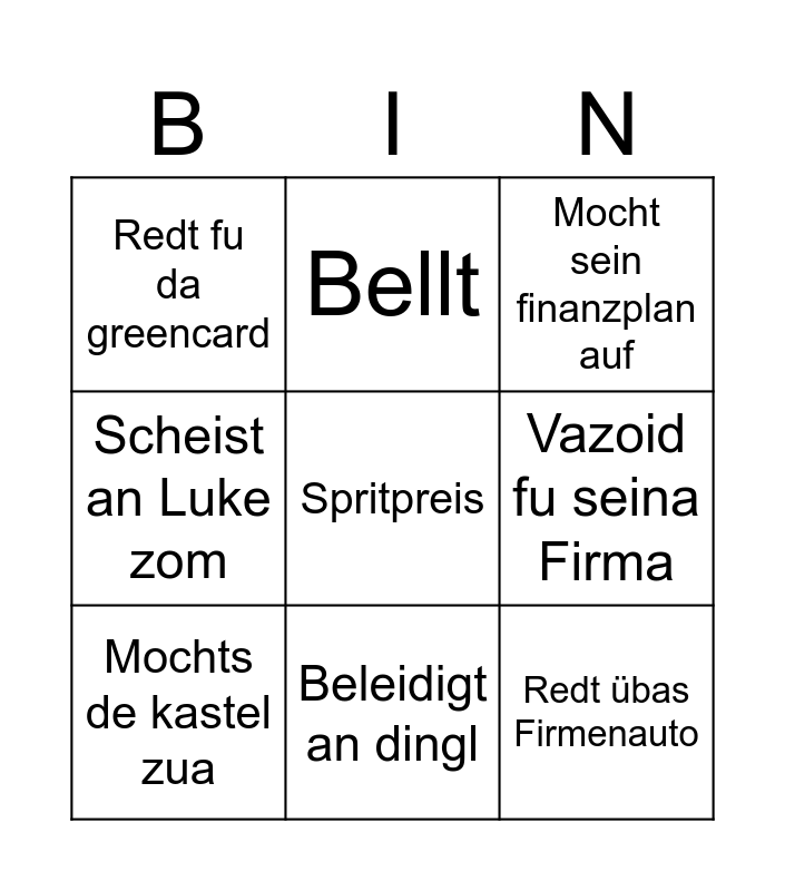 This bingo card has a free space and 8 words: Scheist an Luke zom, Bellt, Vazoid fu seina Firma, Mochts de kastel zua, Mocht sein finanzplan auf, Redt fu da greencard, Beleidigt an dingl and Redt übas Firmenauto.