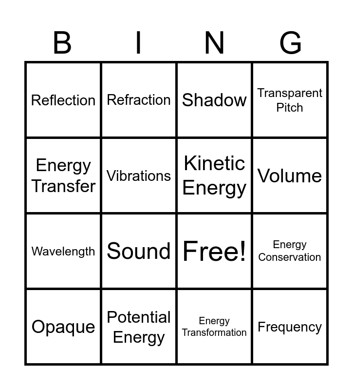 This bingo card has 19 words: Free!, Collision, Shadow, Frequency, Energy Conservation, Energy Transfer, Energy Transformation, Reflection, Refraction, Wavelength, Sound, Vibrations, Kinetic Energy, Potential Energy, Opaque, Translucent, Transparent Pitch, Volume and Amplitude.