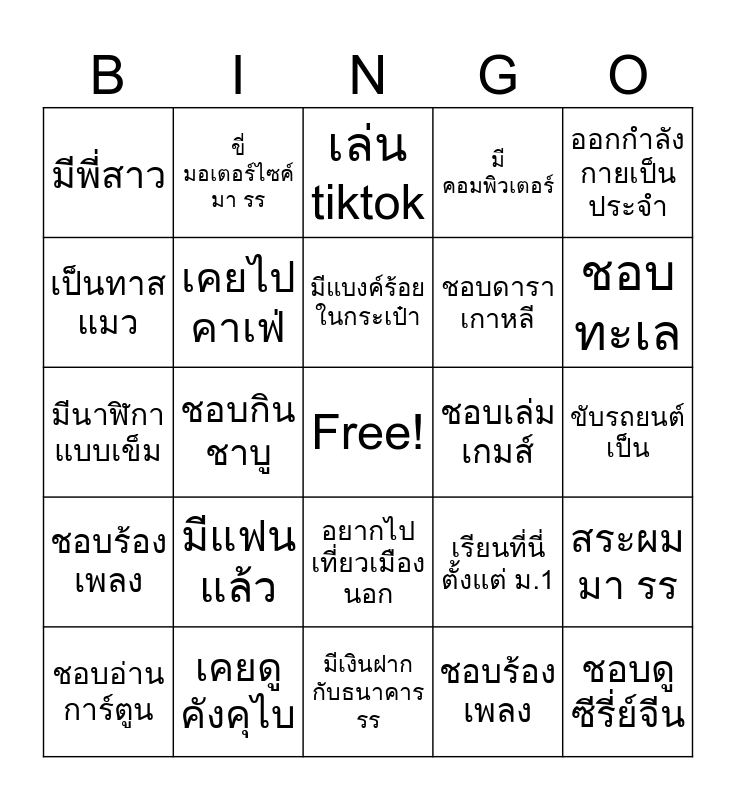 This bingo card has a free space and 24 words: มีแฟนแล้ว, เคยดูคังคุไบ, มีแบงค์ร้อยในกระเป๋า, ชอบอ่านการ์ตูน, ออกกำลังกายเป็นประจำ, มีพี่สาว, เป็นทาสแมว, ขี่มอเตอร์ไซค์มา รร, ชอบเล่มเกมส์, อยากไปเที่ยวเมืองนอก, ชอบดาราเกาหลี, มีนาฬิกาแบบเข็ม, เรียนที่นี่ตั้งแต่ ม.1, สระผมมา รร, เคยไปคาเฟ่, ชอบร้องเพลง, ขับรถยนต์เป็น, เล่น tiktok, ชอบทะเล, ชอบกินชาบู, ชอบดูซีรี่ย์จีน, ชอบร้องเพลง, มีคอมพิวเตอร์ and มีเงินฝากกับธนาคาร รร.