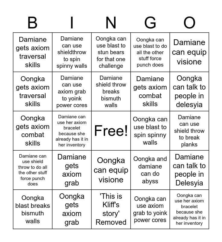 This bingo card has a free space and 24 words: Damiane gets axiom grab, Oongka gets axiom grab, Damiane shield throw breaks bismuth walls, Oongka blast breaks bismuth walls, Damiane can equip visione, Damiane gets axiom traversal skills, Oongka gets axiom traversal skills, Damiane can use shieldthrow to spin spinny walls, Oongka can use blast to spin spinny walls, Oongka can equip visione, Damiane gets axiom combat skills, Oongka gets axiom combat skills, Oongka and damiane can do abyss, Damiane can talk to people in Delesyia, Damiane can use axiom grab to yoink power cores, Oongka can use axiom grab to yoink power cores, Damiane can use shield throw to break planks, Oongka can use blast to stun bears for that one challenge, Oongka can talk to people in delesyia, Damiane can use her axiom bracelet because she already has it in her inventory, Oongka can use her axiom bracelet because she already has it in her inventory, Damiane can use shield throw to do all the other stuff force punch does, Oongka can use blast to do all the other stuff force punch does and 'This is Kliff's story' Removed.