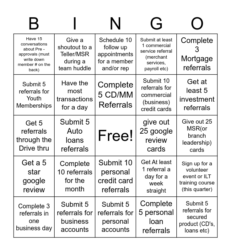 This bingo card has a free space and 24 words: Complete 3 referrals in one business day, Complete 10 referrals for the month, Complete 5 CD/MM Referrals, Complete 5 personal loan referrals, Complete 3 Mortgage referrals, Have 15 conversations about Pre - approvals (must write down member # on the back), Give a shoutout to a Teller/MSR during a team huddle, Schedule 10 follow up appointments for a member and/or rep, give out 25 google review cards, Give out 25 MSR(or branch leadership) cards, Get 5 referrals through the Drive thru, Have the most transactions for a day, Get At least 1 referral a day for a week straight, Sign up for a volunteer event or ILT training course (this quarter), Submit 5 referrals for Youth Memberships, Submit 5 referrals for business accounts, Submit 5 referrals for personal accounts, Submit at least 1 commercial service referral (merchant services, payroll etc), Get at least 5 investment referrals, Get a 5 star google review, Submit 5 Auto loans referrals, Submit 10 personal credit card referrals, Submit 10 referrals for commercial (business) credit cards and Submit 5 referrals for secured product (CD's, loans etc).