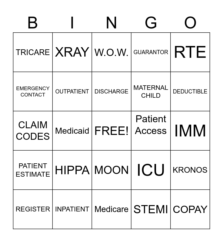 This bingo card has a free space and 37 words: REASON FOR VISIT, PRN, Consent for treatment, OUTPATIENT, KRONOS, HIPPA, DISCHARGE, Insurance Cards, RTE, ER, Medicaid, GUARANTOR, COPAY, IMM, EMERGENCY CONTACT, PATIENT ESTIMATE, ADVANCE DIRECTIVE, W.O.W., MOON, Patient Access, TRICARE, DEDUCTIBLE, REGISTER, Medicare, SURGERY, STEMI, XRAY, ORDERS, MY CHART, PRE-REG, TRAUMA, INPATIENT, CLAIM CODES, MED SURGE, ICU, MATERNAL CHILD and WORK COMP.