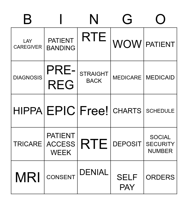 This bingo card has a free space and 29 words: MRI, MAMMO, EPIC, CPT CODE, LAY CAREGIVER, RTE, PRE-REG, PATIENT ACCESS WEEK, CHARTS, CONSENT, SCHEDULE, ORDERS, DENIAL, SELF PAY, MEDICAID, AUTH, RTE, TRICARE, PATIENT, HIPPA, DEPOSIT, ICD 10, MEDICARE, DIAGNOSIS, WOW, PATIENT BANDING, SOCIAL SECURITY NUMBER, STRAIGHT BACK and ELIGIBILITY.