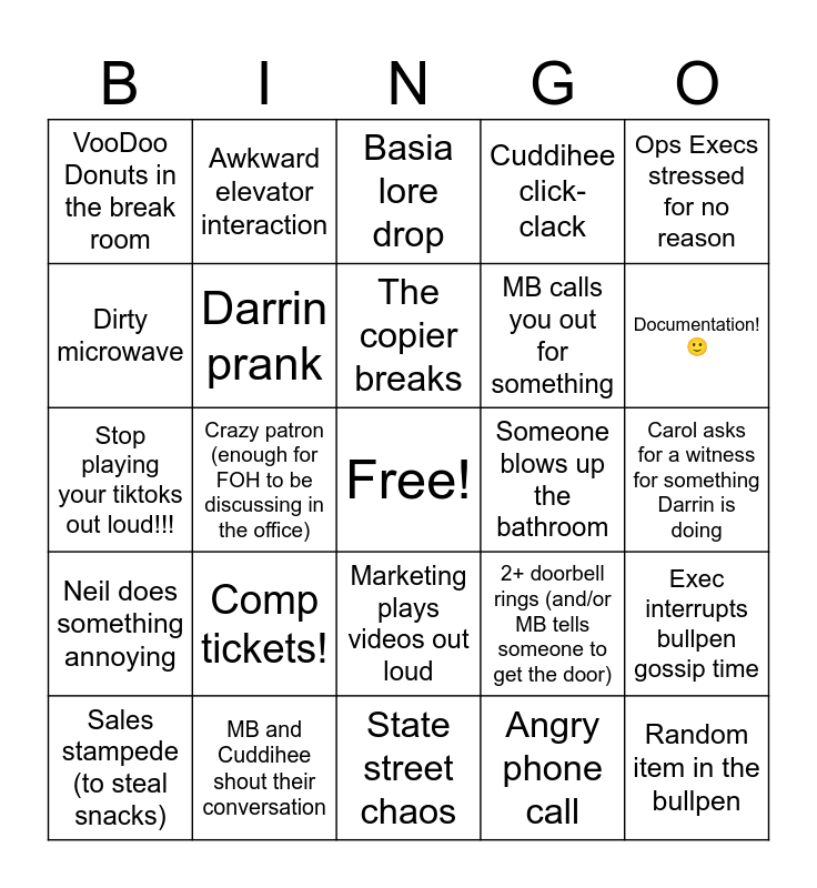 This bingo card has a free space and 35 words: Phone call in the bathroom, Burp in the break room, MB crashout, Darrin prank, Marketing plays videos out loud, Cuddihee click-clack, Dirty microwave, Comic book discussion, The copier breaks, Water cooler malfunction, Stop playing your tiktoks out loud!!!, Ops Execs stressed for no reason, Someone mentions their HS theatre career, (Unhinged) communal snack in the break room, VooDoo Donuts in the break room, Someone blows up the bathroom, Angry phone call, Crazy patron (enough for FOH to be discussing in the office), Neil does something annoying, Random item in the bullpen, 2+ doorbell rings (and/or MB tells someone to get the door), Sales stampede (to steal snacks), Exec interrupts bullpen gossip time, MB and Cuddihee shout their conversation, Basia lore drop, Documentation! 🙂, Learn a new piece of (presumably) confidential BIC info, Someone asks you how to do their job, MB calls you out for something, Carol asks for a witness for something Darrin is doing, Elevator malfunction, State street chaos, Comp tickets!, Awkward elevator interaction and Overheard discussion of IHSMTA.