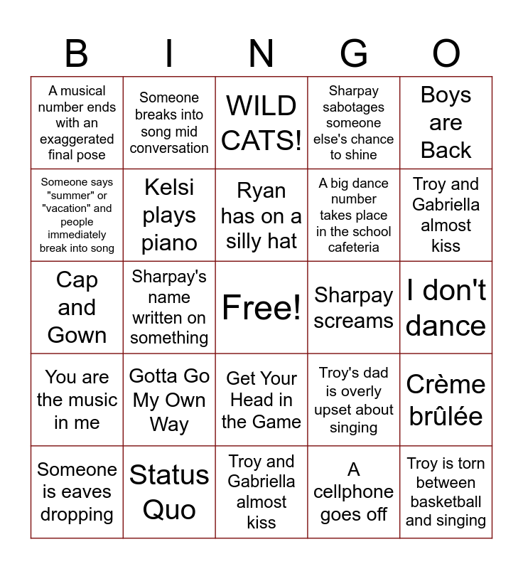 This bingo card has a free space and 32 words: A cellphone goes off, BRR BRR MAH MAH, Sharpay's name written on something, WHAT TEAM!?, You are the music in me, Kelsi plays piano, Boys are Back, Crème brûlée, Someone breaks into song mid conversation, Gabriella cries, Ryan has on a silly hat, WILD CATS!, School Bell Rings, Someone jumps really high in the air, Sharpay screams, Summer! Summer! Summer!, Someone is eaves dropping, Cap and Gown, Get Your Head in the Game, Gotta Go My Own Way, Troy's dad is overly upset about singing, Promposal, I don't dance, Status Quo, Troy is torn between basketball and singing, Sharpay sabotages someone else's chance to shine, A big dance number takes place in the school cafeteria, Someone says "summer" or "vacation" and people immediately break into song, A musical number ends with an exaggerated final pose, Troy and Gabriella almost kiss, There's a basketball on screen and Troy and Gabriella almost kiss.