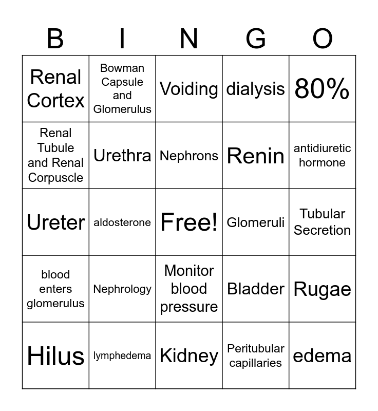 This bingo card has a free space and 25 words: Nephrology, Kidney, Nephrons, Hilus, 80%, Renal Cortex, Renal Tubule and Renal Corpuscle, Bowman Capsule and Glomerulus, Glomeruli, Monitor blood pressure, Renin, Ureter, Bladder, Rugae, Urethra, 99%, Tubular Secretion, Voiding, antidiuretic hormone, aldosterone, edema, lymphedema, blood enters glomerulus, dialysis and Peritubular capillaries.