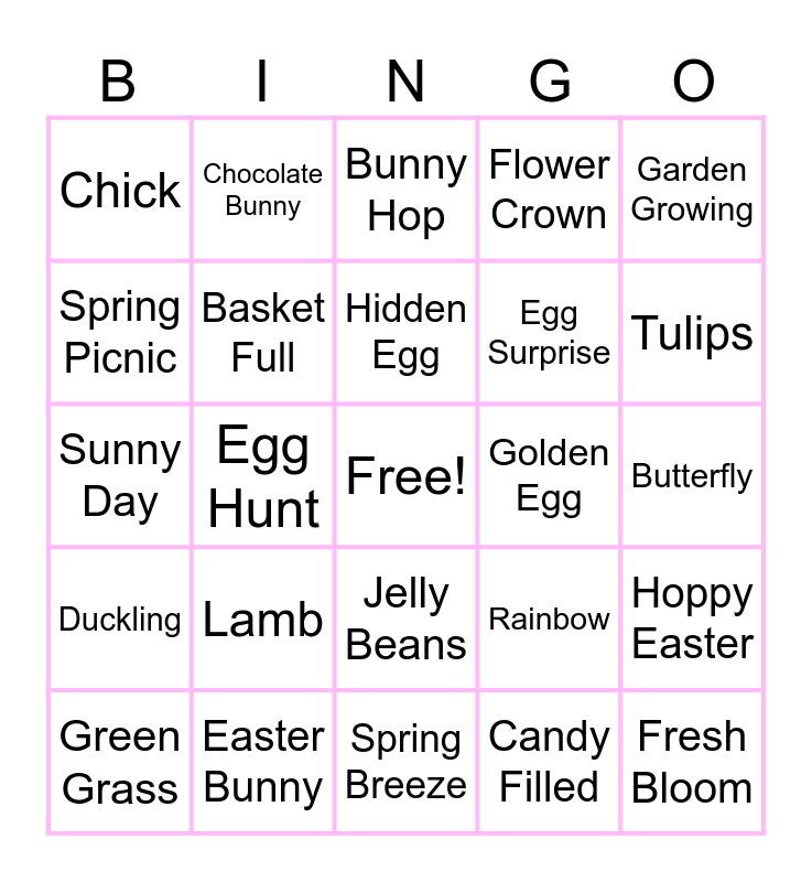This bingo card has a free space and 30 words: Easter Bunny, Blooming Flowers, Egg Hunt, Pastel Colors, Chick, Bunny Hop, Basket Full, Jelly Beans, Golden Egg, Spring Breeze, Butterfly, Fresh Bloom, Candy Filled, Hatching Egg, Tulips, Rain Showers, Rainbow, Duckling, Lamb, Garden Growing, Sunny Day, Buzzing Bee, Chocolate Bunny, Egg Surprise, Spring Picnic, Flower Crown, Hoppy Easter, Green Grass, Hidden Egg and Sweet Treat.