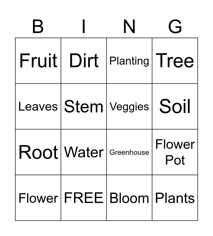 This bingo card has 16 words: FREE, Flower Pot, Planting, Fruit, Root, Dirt, Greenhouse, Bloom, Leaves, Stem, Flower, Tree, Water, Soil, Veggies and Plants.