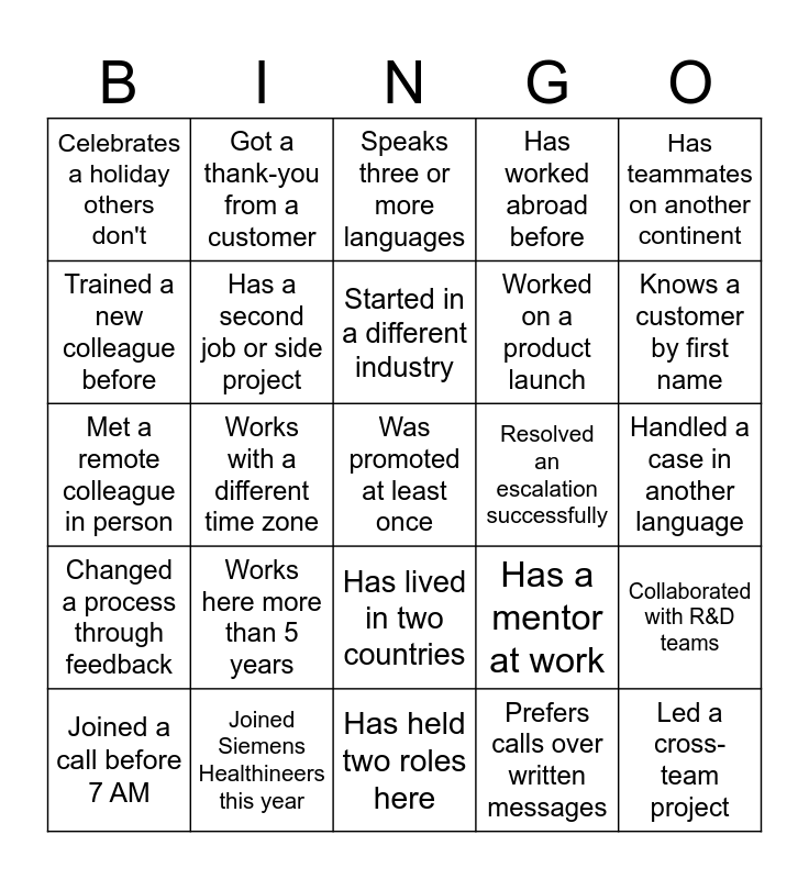 This bingo card has a free space and 24 words: Works here more than 5 years, Joined Siemens Healthineers this year, Started in a different industry, Joined a call before 7 AM, Has teammates on another continent, Celebrates a holiday others don't, Trained a new colleague before, Got a thank-you from a customer, Resolved an escalation successfully, Has lived in two countries, Worked on a product launch, Met a remote colleague in person, Has a mentor at work, Collaborated with R&D teams, Has a second job or side project, Prefers calls over written messages, Handled a case in another language, Speaks three or more languages, Knows a customer by first name, Works with a different time zone, Led a cross-team project, Changed a process through feedback, Has worked abroad before and Has held two roles here.