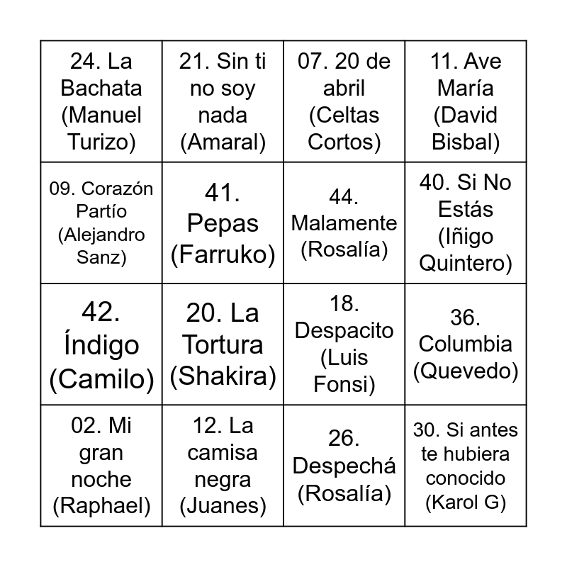 This bingo card has 45 words: 01. Vivir así es morir de amor (Camilo Sesto), 02. Mi gran noche (Raphael), 03. Un beso y una flor (Nino Bravo), 04. Ni tú ni nadie (Alaska), 05. Devuélveme a mi chica (Hombres G), 06. Chiquilla (Seguridad Social), 07. 20 de abril (Celtas Cortos), 08. La Flaca (Jarabe de Palo), 09. Corazón Partío (Alejandro Sanz), 10. Macarena (Los del Río), 11. Ave María (David Bisbal), 12. La camisa negra (Juanes), 13. Suerte (Shakira), 14. Por la raja de tu falda (Estopa), 15. Aserejé (Las Ketchup), 16. Zapatillas (El Canto del Loco), 17. Vivir mi vida (Marc Anthony), 18. Despacito (Luis Fonsi), 19. Bailando (Enrique Iglesias), 20. La Tortura (Shakira), 21. Sin ti no soy nada (Amaral), 22. No dudaría (Rosario Flores), 23. Nochentera (Vicco), 24. La Bachata (Manuel Turizo), 25. Quédate - Bzrp Vol. 52 (Quevedo), 26. Despechá (Rosalía), 27. Todo de ti (Rauw Alejandro), 28. Tacones Rojos (Sebastián Yatra), 29. Vida de Rico (Camilo), 30. Si antes te hubiera conocido (Karol G), 31. Ay Mamá (Rigoberta Bandini), 32. Las Babys (Aitana), 33. Mon Amour Remix (Aitana/Zzoilo), 34. Sessions Vol. 53 (Shakira/Bizarrap), 35. Todo contigo (Álvaro de Luna), 36. Columbia (Quevedo), 37. Tití me preguntó (Bad Bunny), 38. Pareja del Año (Sebastián Yatra), 39. El Tonto (Lola Índigo), 40. Si No Estás (Iñigo Quintero), 41. Pepas (Farruko), 42. Índigo (Camilo), 43. Provenza (Karol G), 44. Malamente (Rosalía) and 45. Quiero decirte (Abraham Mateo/Vicco).