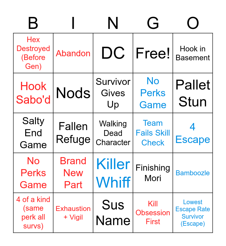 This bingo card has 81 words: E, Clown, DC, Hit on Hook, Killer Leaves Chase, TBAG, Flashlight Save, Map Offering, Tunneling, Hatch Escape, Pain Resonance, NOED, Free!, Hex Destroyed (Before Gen), Mori, Hook Sabo'd, Slugged, Brand New Part, 4k, 4 Escape, Escape With New Item, Hook in Basement, Salty End Game, Survivor Gives Up, Nods, nice killer, Finesse, Gen Rushed, P100, TTV, Pallet Stun, Stealth Killer, Sus Name, Lowest Escape Rate Survivor (Escape), 4 of a kind (same perk all survs), Team Fails Skill Check, Boon, Lowest Kill Rate Killer 4k, Corrupt, 4 Gen Perks, Walking Dead Character, Double Iri, Stealthy Survivor(s), Killer <2% Pick Rate, Fallen Refuge, Eyrie of Crows, Abandon, Bloodshot eye, Hex/Boon Name, Double Exhaustion, Finishing Mori, Bamboozle, Wesker, Grabbed (gen, locker window), Decisive Strike, Shirtless Survivor, Exposed Down, Wholesome End Game, Indoor Map, Escape Random Build, Killer Whiff, 4k Random Build, Survivor Dead Before 4 Gens, Survivor Drops Item, Interrupt Survivor on Door, Syringe, Hatch Offering, Fazbear's Pizza, Luck Offering, Lara Cosmetic, Grab Survivor in Security Door, No Perks Game, Exhaustion + Vigil, Ghoul, Friends 'til the End, Play Lowest Pick Rate Killer, Bring at least 3 of same item, Kill Obsession First, Wait in Exit Gate, No Perks Game and Fog Vial Escape.