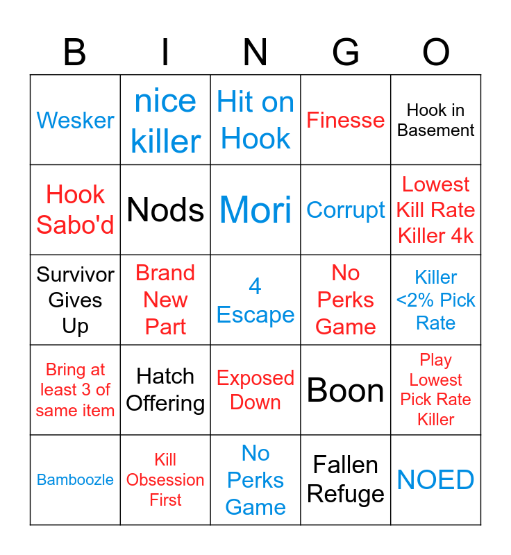 This bingo card has 75 words: Clown, DC, Hit on Hook, Killer Leaves Chase, TBAG, Flashlight Save, Map Offering, Tunneling, Hatch Escape, Pain Resonance, NOED, Free!, Mori, Hook Sabo'd, Slugged, Brand New Part, 4k, 4 Escape, Escape With New Item, Hook in Basement, Salty End Game, Survivor Gives Up, Nods, nice killer, Finesse, P100, TTV, Pallet Stun, Stealth Killer, Sus Name, Lowest Escape Rate Survivor (Escape), 4 of a kind (same perk all survs), Team Fails Skill Check, Boon, Lowest Kill Rate Killer 4k, Corrupt, Double Iri, Stealthy Survivor(s), Killer <2% Pick Rate, Fallen Refuge, Eyrie of Crows, Abandon, Bloodshot eye, Hex/Boon Name, Double Exhaustion, Finishing Mori, Bamboozle, Wesker, Grabbed (gen, locker window), Decisive Strike, Shirtless Survivor, Exposed Down, Wholesome End Game, Indoor Map, Escape Random Build, Killer Whiff, 4k Random Build, Survivor Dead Before 4 Gens, Survivor Drops Item, Interrupt Survivor on Door, Hatch Offering, Fazbear's Pizza, Luck Offering, Lara Cosmetic, Grab Survivor in Security Door, No Perks Game, Exhaustion + Vigil, Ghoul, Friends 'til the End, Play Lowest Pick Rate Killer, Bring at least 3 of same item, Kill Obsession First, Wait in Exit Gate, No Perks Game and Fog Vial Escape.