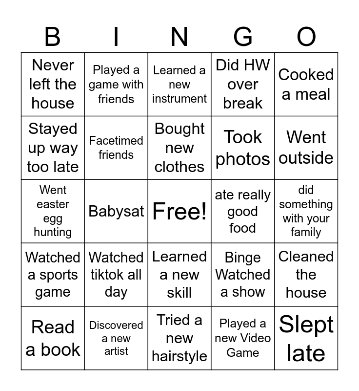 This bingo card has a free space and 24 words: Read a book, Watched tiktok all day, Bought new clothes, Played a new Video Game, Cooked a meal, Never left the house, Played a game with friends, Learned a new instrument, ate really good food, did something with your family, Went easter egg hunting, Facetimed friends, Binge Watched a show, Cleaned the house, Stayed up way too late, Discovered a new artist, Tried a new hairstyle, Did HW over break, Went outside, Watched a sports game, Babysat, Learned a new skill, Took photos and Slept late.