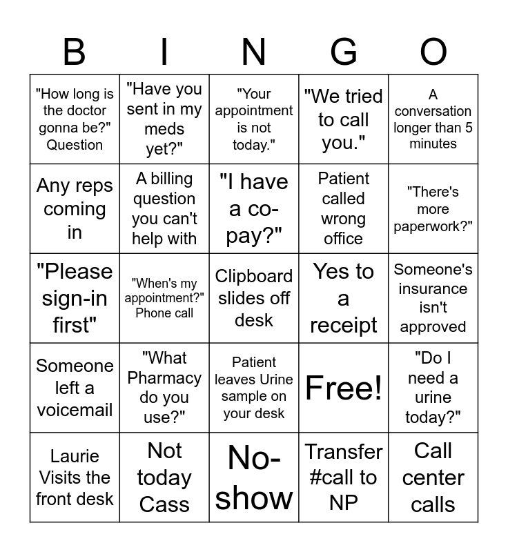 This bingo card has 25 words: "What Pharmacy do you use?", No-show, "I have a co-pay?", Laurie Visits the front desk, A conversation longer than 5 minutes, "How long is the doctor gonna be?" Question, Any reps coming in, "Have you sent in my meds yet?", Yes to a receipt, Patient leaves Urine sample on your desk, Patient called wrong office, "Please sign-in first", Free!, "Do I need a urine today?", A billing question you can't help with, Call center calls, Someone's insurance isn't approved, "Your appointment is not today.", "There's more paperwork?", "When's my appointment?" Phone call, Clipboard slides off desk, Not today Cass, Someone left a voicemail, "We tried to call you." and Transfer #call to NP.