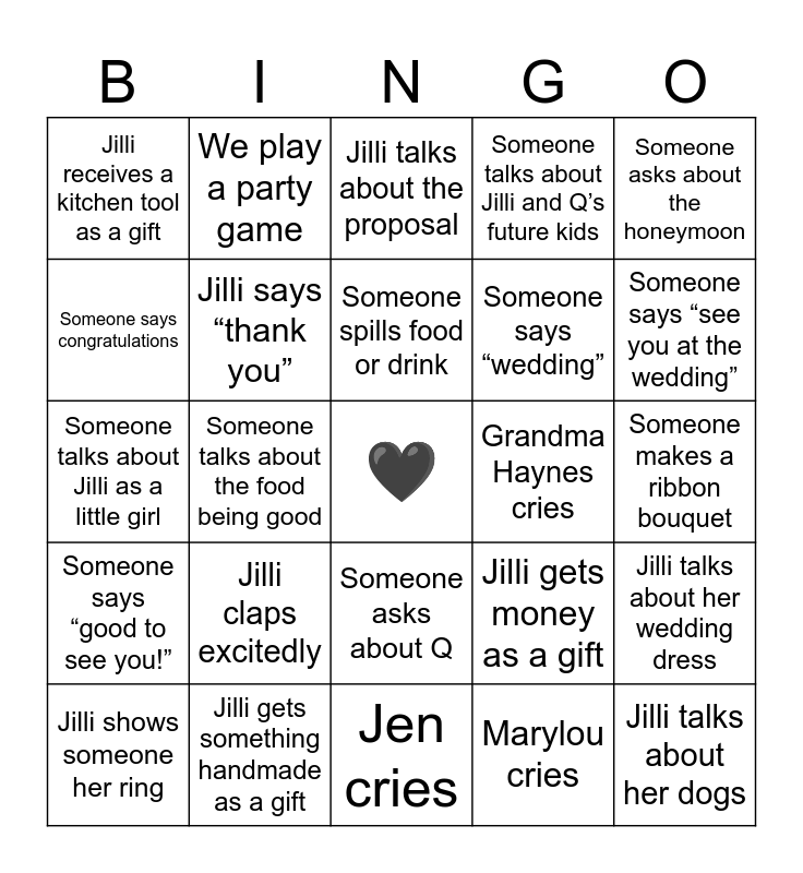 This bingo card has a free space and 24 words: Jilli claps excitedly, Jilli gets something handmade as a gift, Someone spills food or drink, Jilli shows someone her ring, Someone asks about the honeymoon, Jilli receives a kitchen tool as a gift, Someone says congratulations, We play a party game, Grandma Haynes cries, Someone asks about Q, Someone says “wedding”, Someone talks about Jilli as a little girl, Jilli gets money as a gift, Jilli talks about her wedding dress, Jilli says “thank you”, Marylou cries, Someone makes a ribbon bouquet, Jilli talks about the proposal, Someone says “see you at the wedding”, Someone talks about the food being good, Jilli talks about her dogs, Someone says “good to see you!”, Someone talks about Jilli and Q’s future kids and Jen cries.