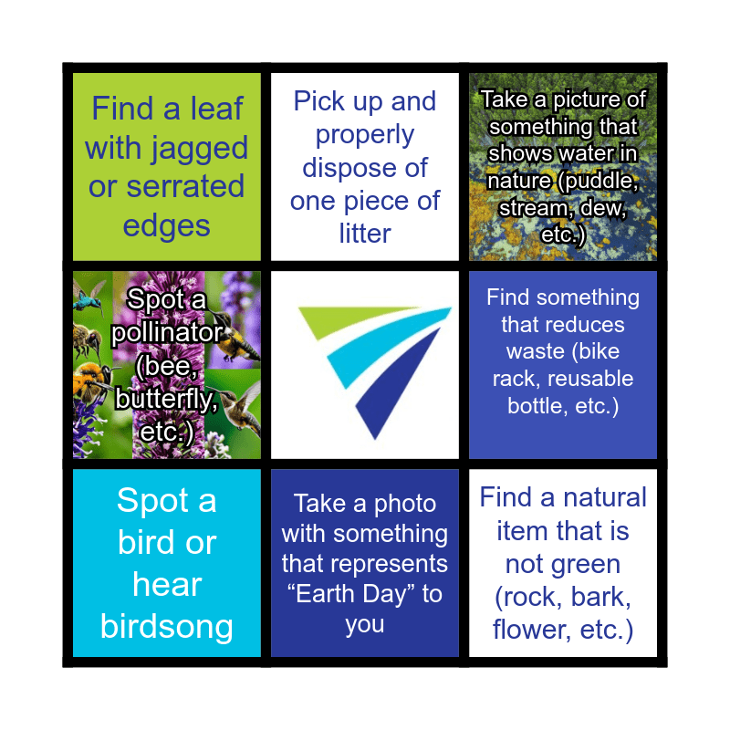 This bingo card has 2 images, a free space and 8 words: Find something that reduces waste (bike rack, reusable bottle, etc.), Take a picture of something that shows water in nature (puddle, stream, dew, etc.), Pick up and properly dispose of one piece of litter, Spot a bird or hear birdsong, Find a leaf with jagged or serrated edges, Find a natural item that is not green (rock, bark, flower, etc.), Spot a pollinator (bee, butterfly, etc.) and Take a photo with something that represents “Earth Day” to you.