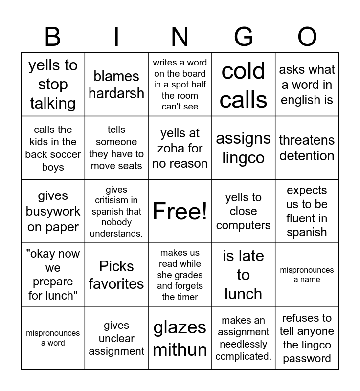 This bingo card has a free space and 24 words: Picks favorites, gives unclear assignment, yells at zoha for no reason, mispronounces a word, asks what a word in english is, yells to stop talking, calls the kids in the back soccer boys, blames hardarsh, yells to close computers, makes us read while she grades and forgets the timer, assigns lingco, gives busywork on paper, is late to lunch, mispronounces a name, tells someone they have to move seats, makes an assignment needlessly complicated., expects us to be fluent in spanish, writes a word on the board in a spot half the room can't see, threatens detention, gives critisism in spanish that nobody understands., refuses to tell anyone the lingco password, "okay now we prepare for lunch", cold calls and glazes mithun.