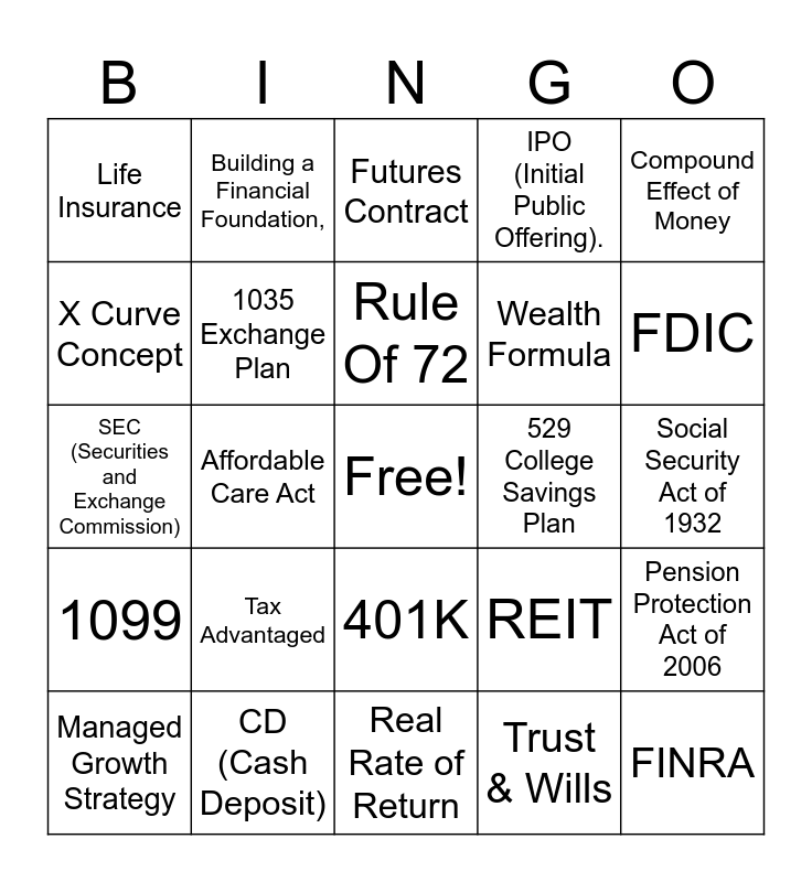 This bingo card has a free space and 24 words: Tax Advantaged, CD (Cash Deposit), Rule Of 72, Managed Growth Strategy, Compound Effect of Money, Life Insurance, X Curve Concept, Building a Financial Foundation,, 529 College Savings Plan, 401K, Wealth Formula, SEC (Securities and Exchange Commission), REIT, Pension Protection Act of 2006, 1035 Exchange Plan, Trust & Wills, Social Security Act of 1932, Futures Contract, FDIC, Affordable Care Act, FINRA, 1099, IPO (Initial Public Offering). and Real Rate of Return.