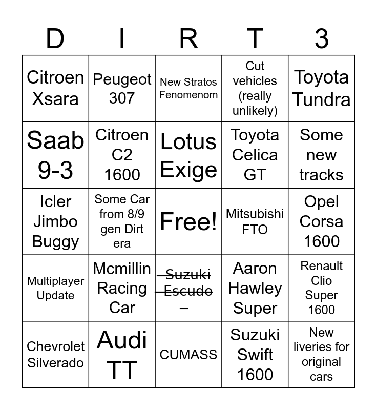 This bingo card has a free space and 24 words: Mcmillin Racing Car, Audi TT, Lotus Exige, Chevrolet Silverado, Toyota Tundra, Citroen Xsara, Saab 9-3, Peugeot 307, Mitsubishi FTO, ̶S̶u̶z̶u̶k̶i̶ ̶E̶s̶c̶u̶d̶o̶ ̶, Toyota Celica GT, Icler Jimbo Buggy, Aaron Hawley Super, Renault Clio Super 1600, Citroen C2 1600, Suzuki Swift 1600, Opel Corsa 1600, New Stratos Fenomenom, Some new tracks, Some Car from 8/9 gen Dirt era, New liveries for original cars, Multiplayer Update, Cut vehicles (really unlikely) and CUMASS.