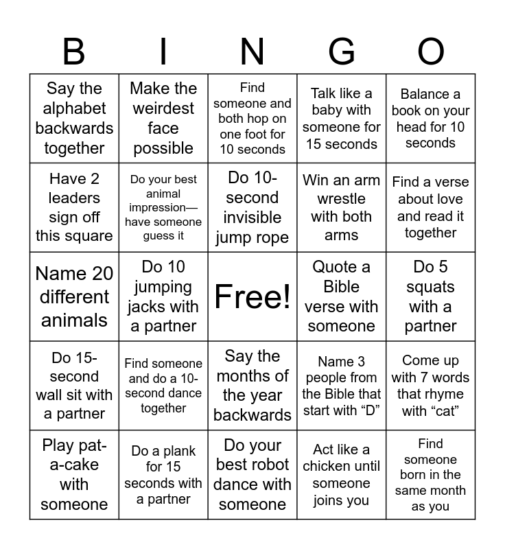 This bingo card has a free space and 29 words: Play pat-a-cake with someone, Count to 40 with someone (alternating numbers), Do 10 jumping jacks with a partner, Learn and perform a handshake with someone, Say the alphabet backwards together, Find someone and both hop on one foot for 10 seconds, Do your best animal impression—have someone guess it, Find someone and do a 10-second dance together, Quote a Bible verse with someone, Do a plank for 15 seconds with a partner, Do 5 squats with a partner, Find someone born in the same month as you, Do your best robot dance with someone, Act like a chicken until someone joins you, Find a verse about love and read it together, Name all 12 of the disciples, Say the months of the year backwards, Do 15-second wall sit with a partner, Balance a book on your head for 10 seconds, Name 20 different animals, Name 3 people from the Bible that start with “D”, Win a rock-paper-scissors best of 5, Win an arm wrestle with both arms, Have 2 leaders sign off this square, Talk like a baby with someone for 15 seconds, Make the weirdest face possible, Come up with 7 words that rhyme with “cat”, Do 10-second invisible jump rope and Mirror your partner for 20 seconds.