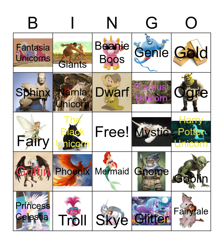 This bingo card has 29 images, a free space and 29 words: Princess Celestia, Rainbow, The Black Unicorn, Unicorn Drink, Fantasia Unicorns, Beanie Boos, Narnia Unicorn, Phoenix, Mystic, Troll, Harry Potter Unicorn, Fairytale, Skye, Glitter, Ogre, Dragon, Mermaid, Griffin, Gold, Fairy, Gnome, Leprechaun, Stardust Unicorn, Sphinx, Genie, Giants, Goblin, Dwarf and Hobbit.