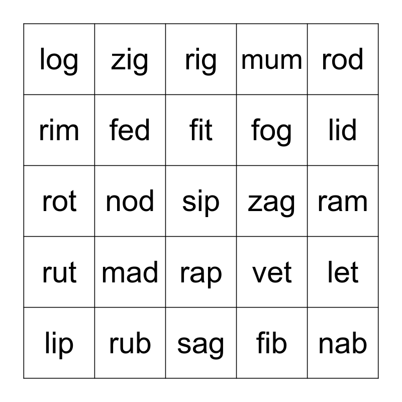 This bingo card has 25 words: mad, sag, fit, lip, rod, log, rim, zig, zag, rap, fog, rot, vet, let, fed, nab, ram, rig, lid, nod, sip, rub, rut, mum and fib.